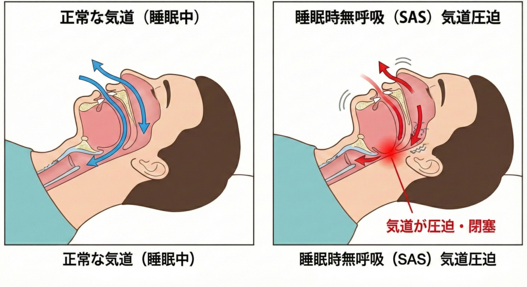 いびきは、睡眠中に空気の通り道(気道)が狭くなることで発生します 。もし完全に塞がって「無呼吸」の状態になると、体は酸素不足に陥ります。